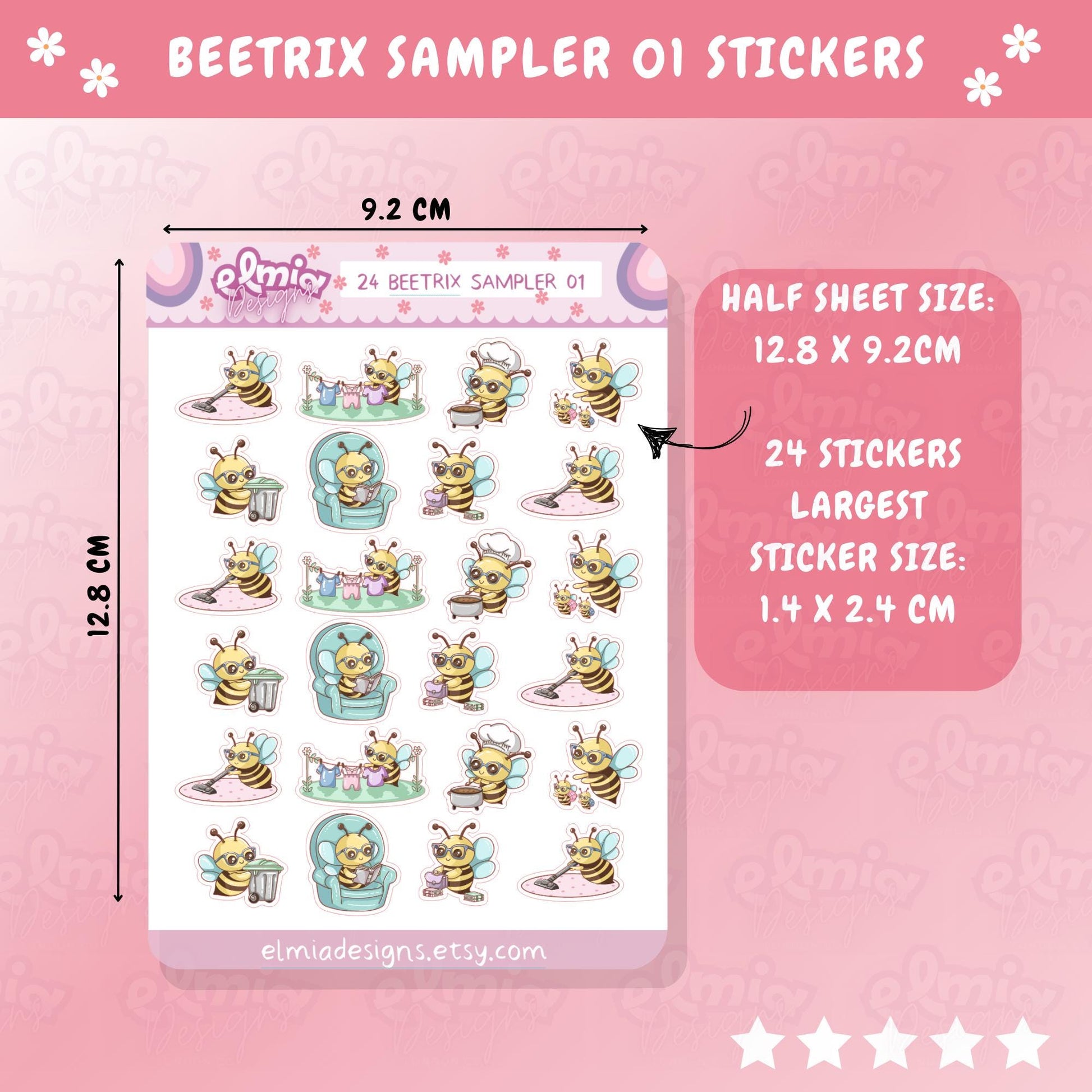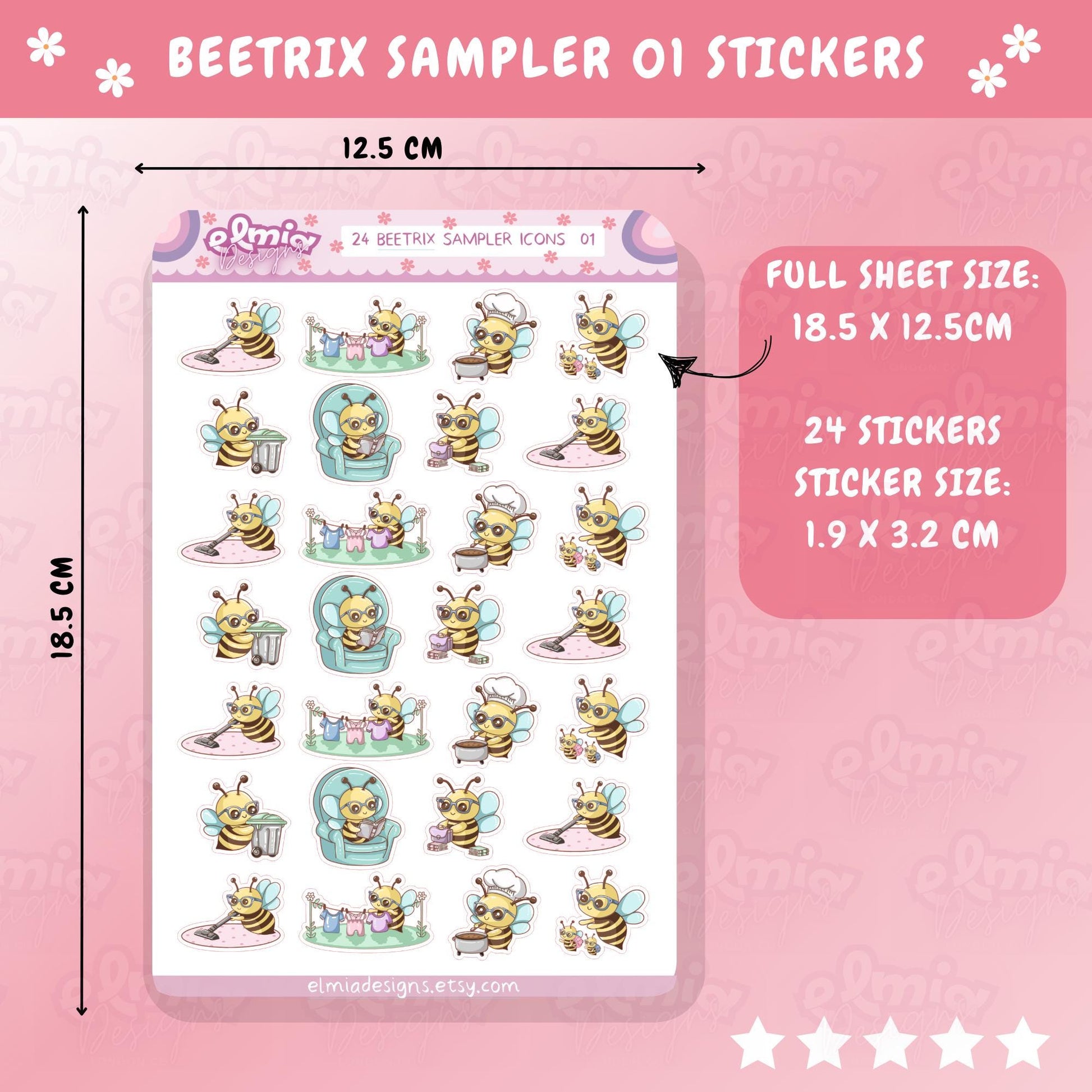 PRINTED Cute Kawaii Beetrix Bee sampler icons 01 | Planner sticker | journal | Housework | Reading | Bin Day | Chores | Planning | Character